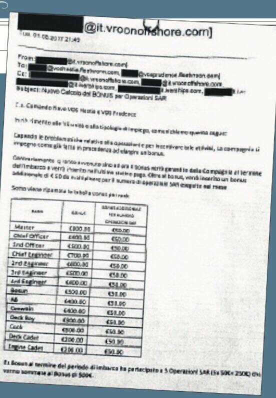 Arriviamo così a quanto è accaduto al 23 ottobre scorso, quando a bordo della Vos Hestia attraccata al porto di Catania salgono gli uomini del Servizio centrale operativo su ordine della Procura di Trapani, per una perquisizione della nave. Arrivano così le prime indiscrezioni sul materiale trovato sulla Vos Hestia, grazie al giornalista Fausto Biloslavo de Il Giornale e a La Verità, che pubblica il “Tariffario” dei compensi dei volontari di Save The Children. Si scopre che l’organizzazione salva bambini pagava 50€ a testa per ogni salvataggio al largo delle coste libiche, un vero e proprio incentivo umanitario.